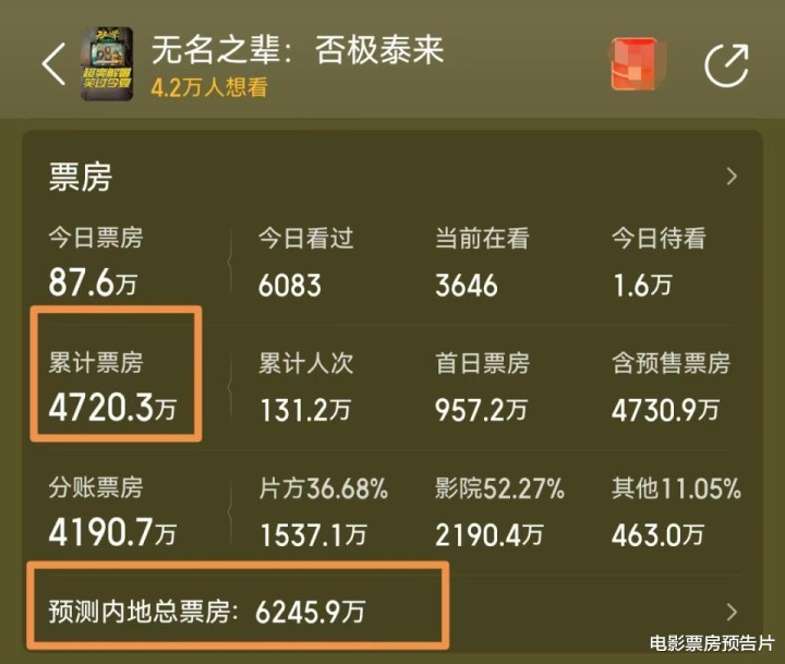 现在《无名之辈:否极泰来》上映第六天,票房4700万,预测票房为6200万,排名跌到第8名位置,基本失去了竞争力。