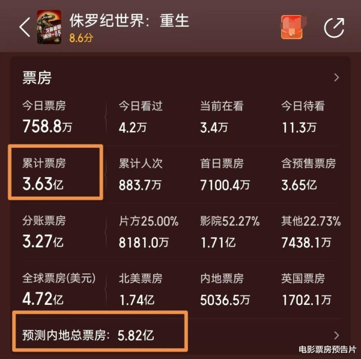 一部是环球影业超强大IP《侏罗纪世界4》,内地上映8天,蝉联8天单日票房冠军,目前票房为3.63亿,档期内所有影片均不是恐龙的对手。