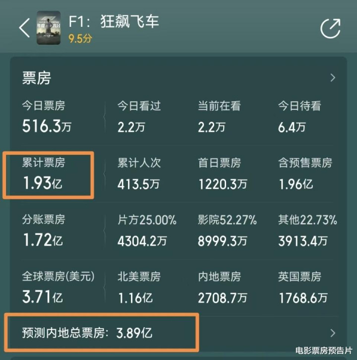 截至发稿时,《F1》内地票房斩获1.93亿,占比已经冲到21%,预测总票房直奔4亿而去。
